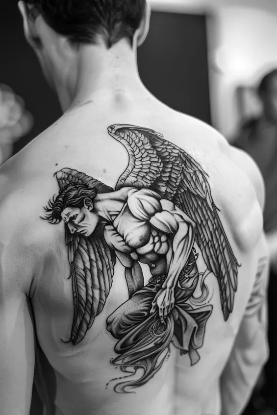 This dramatic back tattoo features a powerful fallen angel, wings spread wide with an intense, brooding expression. The muscular details and intricate shading create a bold and striking design, while the angel s pose kneeling with a solemn gaze adds depth and emotion. The large scale of this tattoo makes it a true centerpiece, commanding attention with its stunning artistry.