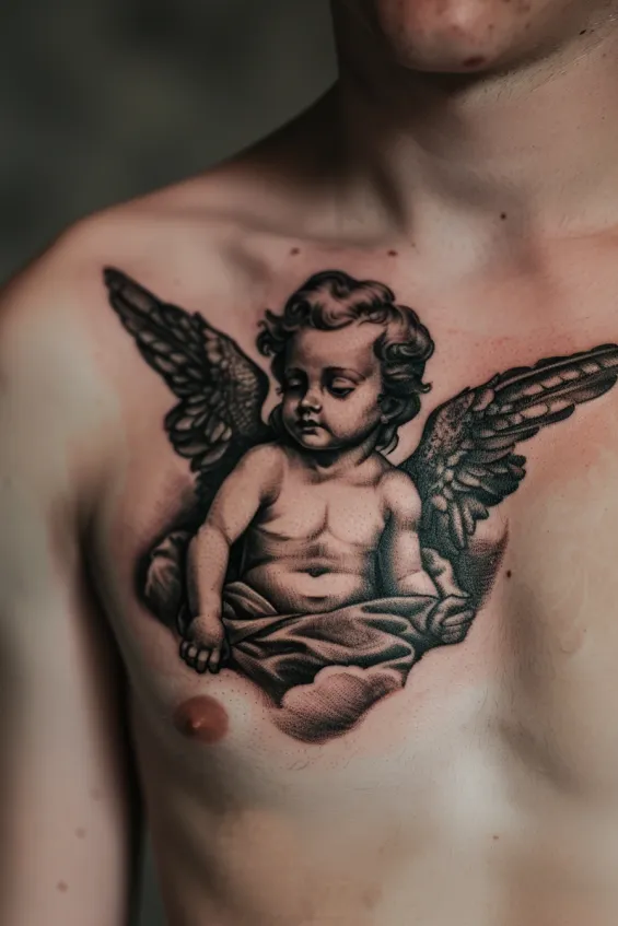 This breathtaking chest tattoo features a classic cherub with intricately detailed wings and a soft, serene expression. The shading is masterfully done, creating a lifelike depth that makes the angel appear as though it s emerging from the skin. Positioned at the center of the chest, the design gives a strong yet sentimental feel, making it a striking piece of body art.