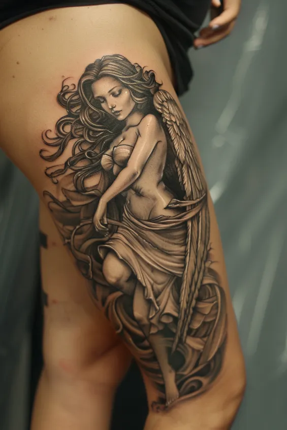 This breathtaking thigh tattoo features a graceful guardian angel with flowing hair, delicately detailed wings, and a soft, serene expression. The intricate shading adds a sculptural quality, making the angel appear almost lifelike. The draped fabric and gentle movement in the design create a sense of divine elegance, perfectly complementing the natural curves of the thigh.