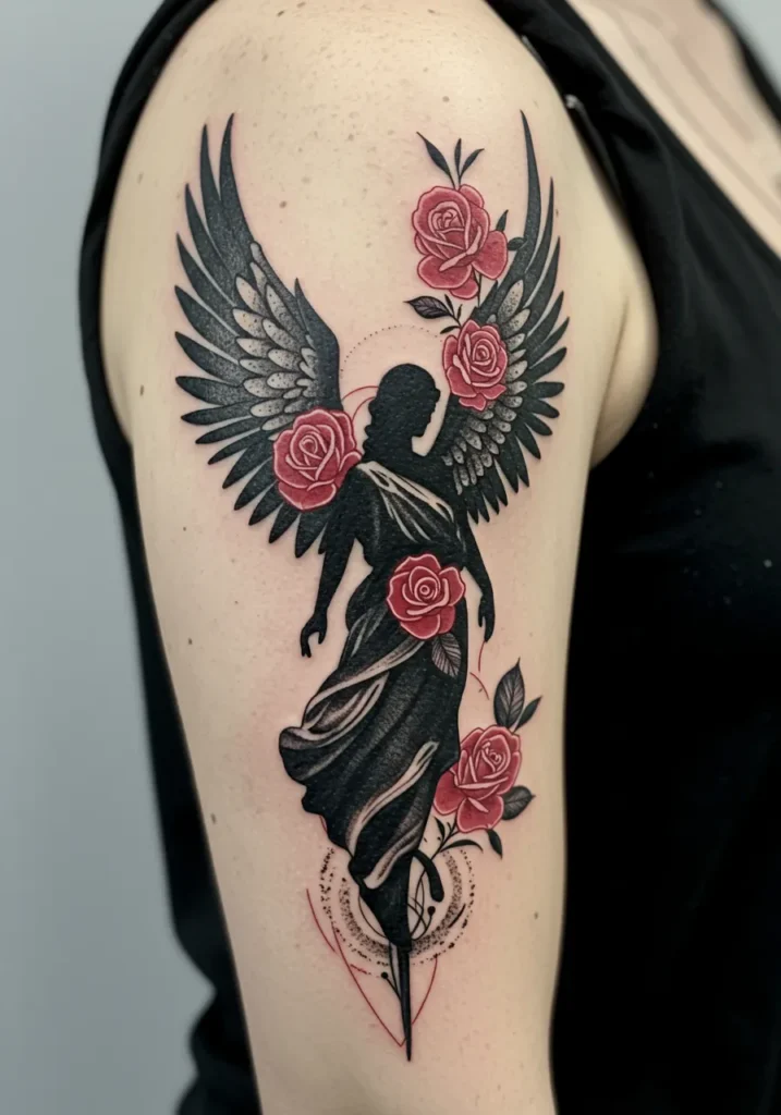This upper arm tattoo is an absolute showstopper. It features a solid black silhouette of an angel with large, intricately detailed wings. The contrast in this piece is just incredible, with vibrant red roses blooming around the dark figure, adding a stunning pop of color. The angel s flowing gown cleverly tapers to a point, reminiscent of a sword or dagger, while subtle dotwork and fine geometric lines at the base add a touch of modern flair.