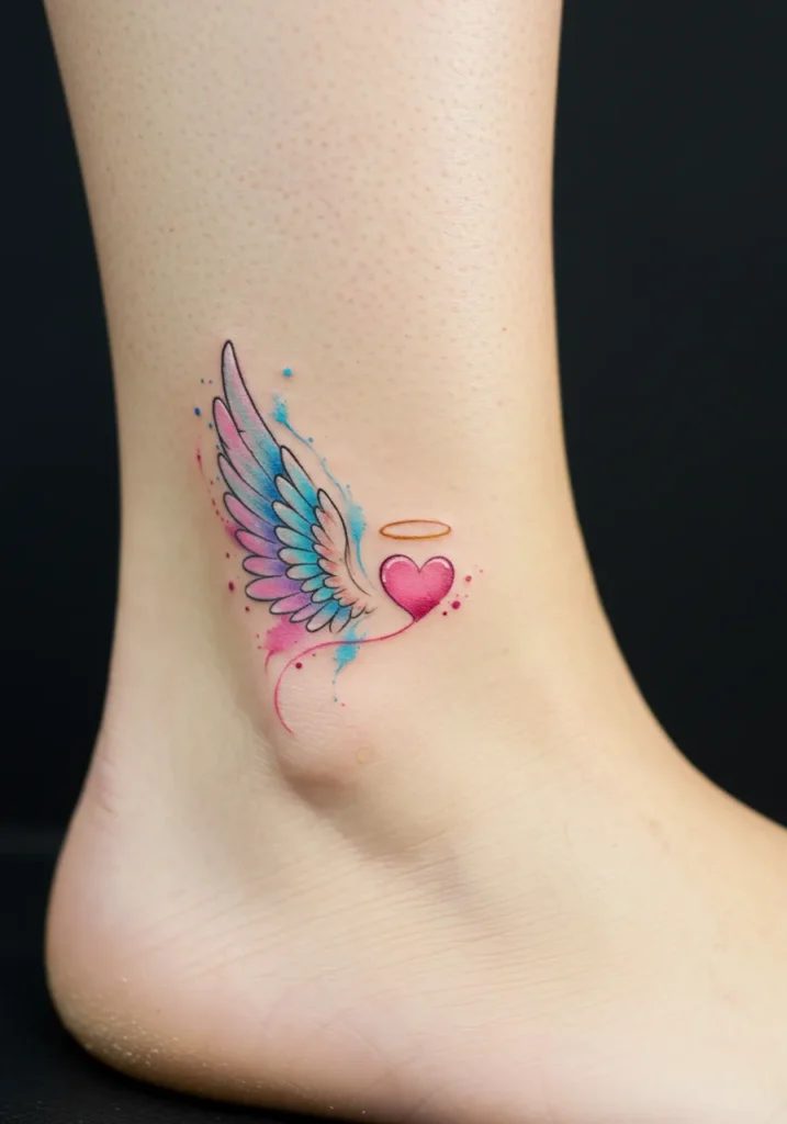 This sweet little ankle tattoo features a vibrant pink heart with a golden halo floating above it and a soft, feathery angel wing wrapping around from the side. The colors are dreamy, blending pink, lavender, and sky blue in watercolor-style splashes that give it a fun, whimsical vibe. The wing is full of detail but still looks light and airy, like it might flutter with your every step.