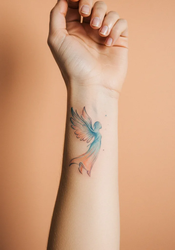 This dreamy wrist tattoo shows a flowing angel figure in soft watercolor shades of teal and peach, with wings stretched high and a long, drifting gown. The lines are light and wispy, almost like the angel is caught mid-movement. There s no harsh detail just graceful curves and that soft, painted glow that makes it feel like it floated right onto the skin.