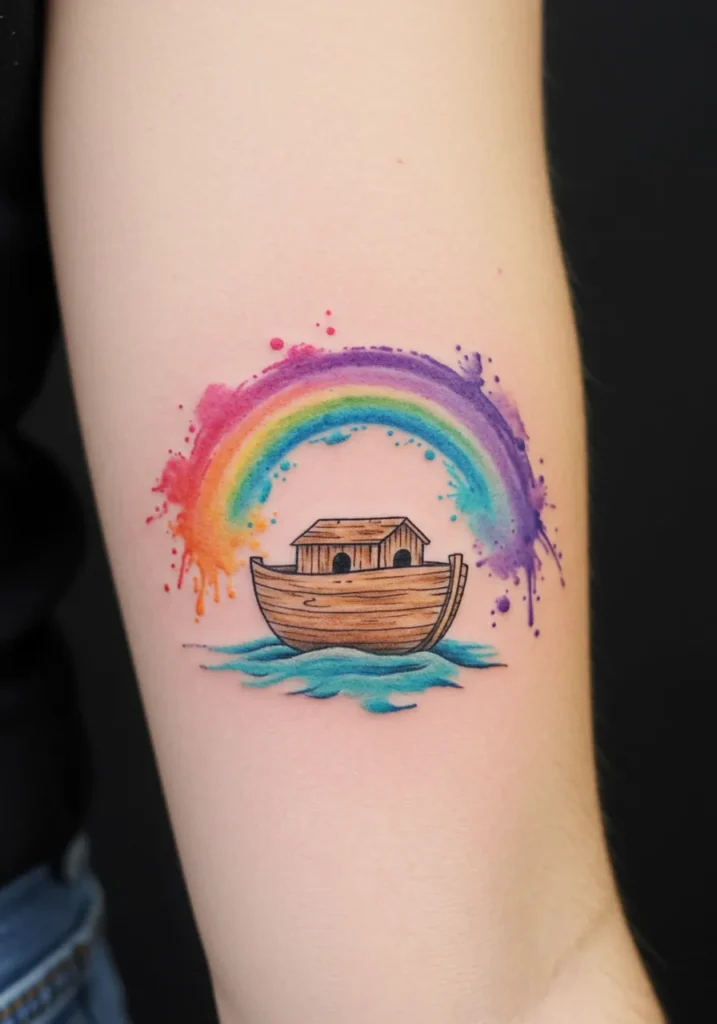 This playful little tattoo brings the story of Noah s Ark to life in the most colorful way. It features a cute, cartoon-style ark bobbing on gentle blue waves, with a bold watercolor rainbow arcing overhead. The rainbow has these fun paint splatters at the edges that give it a modern, artsy twist. Everything about it feels cheerful and full of promise.