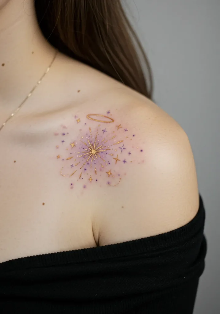 This shoulder tattoo is pure sparkle and softness. It features a delicate golden halo hovering above a radiant starburst, all surrounded by tiny golden and purple stars. The colors are dreamy, with soft lavender clouds and glittery gold dots that make it feel straight out of a fairytale sky. Everything is so fine-lined and airy, it almost looks like it s glowing on your skin.