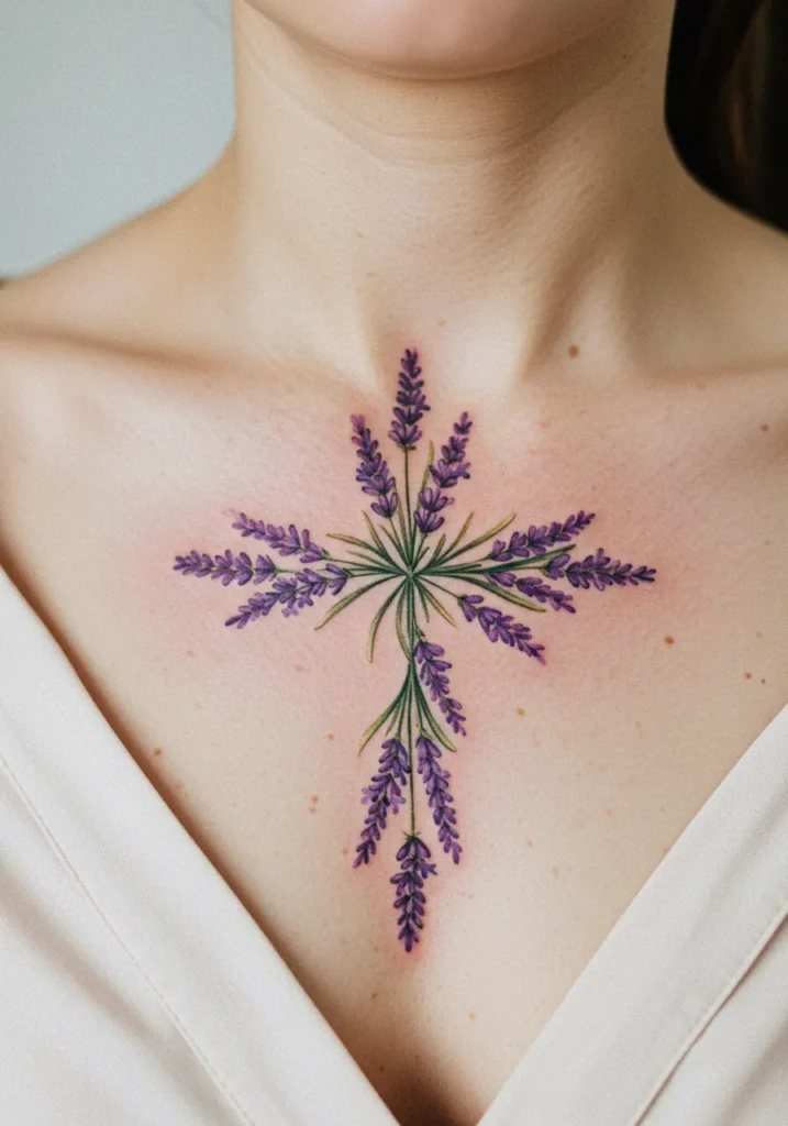 This absolutely gorgeous tattoo reimagines the classic cross symbol using delicate sprigs of lavender. The design is placed perfectly on the sternum, with the purple blossoms and slender green stems forming the four points of the cross. The artist used a fine-line technique with soft color blending, giving the tattoo a vibrant yet gentle watercolor appearance.
