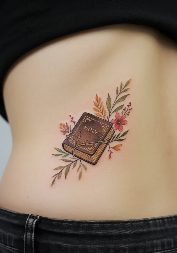 This beautifully placed side tattoo features a small, vintage-style Holy Bible surrounded by delicate leaves and soft pink-orange florals. The book itself is detailed with golden lettering and ornamental corners, giving it a timeless and almost storybook look. The foliage wraps gently around the Bible like it s being protected or cherished, and the warm tones make the whole piece feel cozy and feminine.
