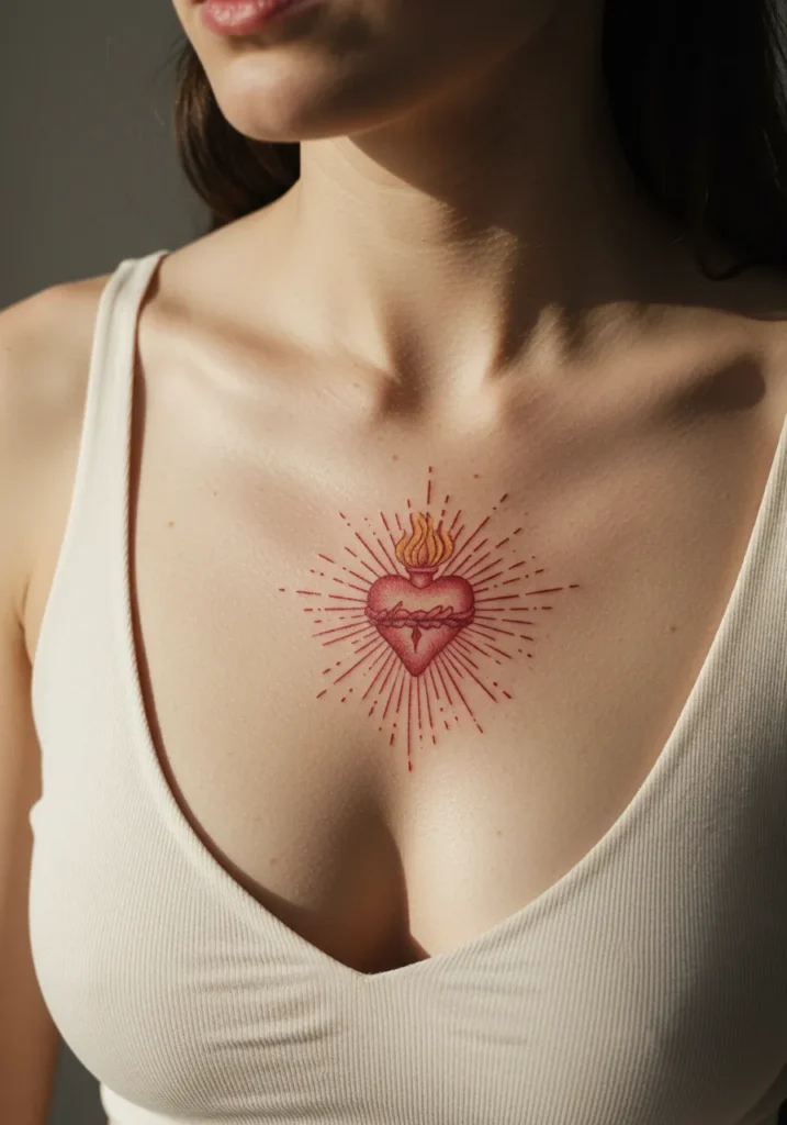 This bold chest piece features the iconic Sacred Heart, glowing in rich red ink with radiant beams extending outward. Wrapped in a delicate crown of thorns and topped with a flickering flame, the design captures both suffering and love in one powerful symbol. The placement right at the center of the chest makes it feel deeply personal, almost like it s beating right from within.