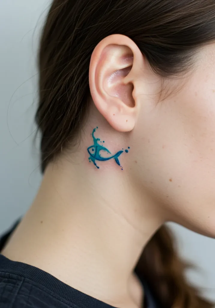 Tucked just behind the ear, this tiny watercolor tattoo features a stylized Ichthys fish in dreamy shades of turquoise and blue. It has that soft, paint-splatter vibe that makes it look like it was dabbed on with a brush rather than a needle. The shape is subtle but unmistakably Christian, and the location adds a cute rebellious twist without being loud about it.