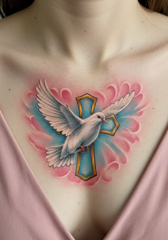 This stunning chest piece is a beautiful explosion of color and faith. A brilliantly white dove, symbolizing the Holy Spirit, is captured mid-flight with its wings spread wide. Behind it rests a stylized cross, outlined in warm gold and filled with a serene sky blue. The entire scene is surrounded by a heavenly aura of soft pink and blue clouds, blended together seamlessly for a dreamy, watercolor effect.