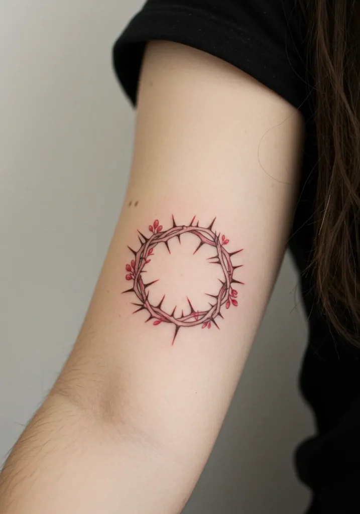 This minimalist upper arm tattoo features a dainty yet powerful crown of thorns, perfectly inked in fine black lines with soft red accents. The delicate blood droplets add a quiet but emotional depth, without going over the top. It s placed right on the outer arm where it sits like a subtle circle of strength and sacrifice. Despite the subject matter, the design feels clean and even a little elegant.