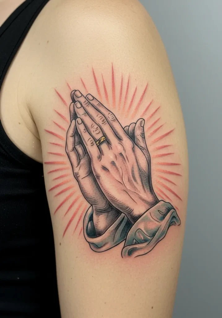 This upper arm tattoo showcases the classic image of two hands clasped in prayer, done in gorgeous black and grey shading. There s a gold wedding band on one finger that adds a really personal touch, and behind the hands, soft red rays radiate out like a quiet halo. The detailing on the folds of the sleeves and the skin makes it feel beautifully realistic without being too heavy.