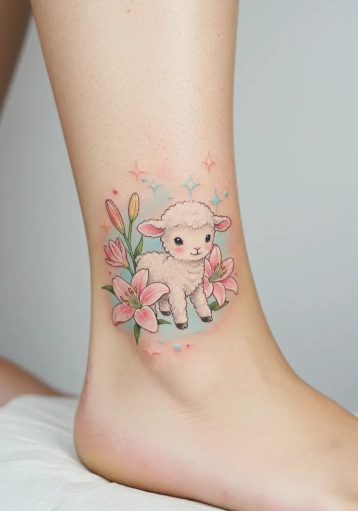 This ankle tattoo is basically pure sunshine wrapped in ink. It features an absolutely adorable little lamb with big sparkling eyes, surrounded by soft pink lilies and pastel-colored stars. The whole thing is shaded with a soft blue glow that makes it feel like the lamb just stepped out of a storybook garden. Everything about it screams sweet and comforting.