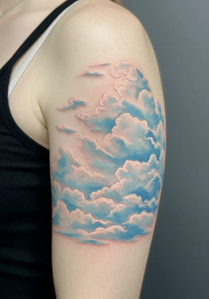 This soft and dreamy upper arm tattoo is a full sleeve of fluffy clouds painted in pastel pinks and serene blues. It wraps around the arm like a watercolor sky, with no outlines just layers of gentle shading that give it a soft, airy depth. The texture is so smooth and ethereal, you almost expect the clouds to move.
