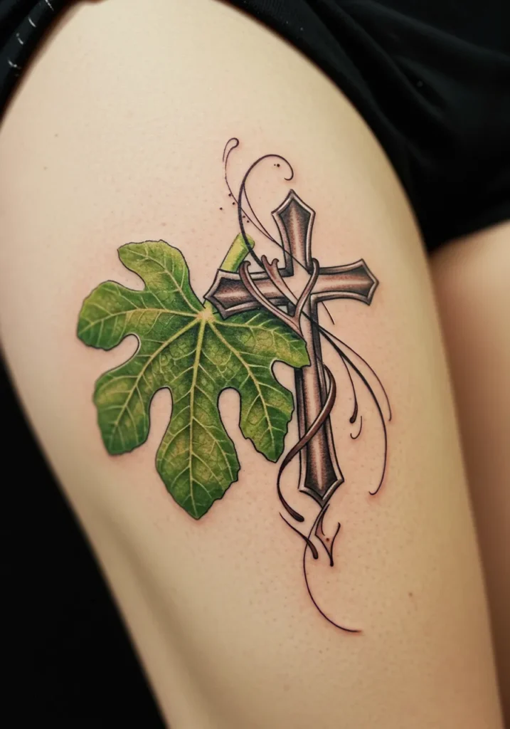 This unique thigh tattoo blends a bold, gothic-style cross with a soft, realistic fig leaf nestled against it. Delicate vine-like swirls wrap around both elements, tying them together in a graceful flow. The contrast between the vibrant green leaf and the sharp-edged cross creates such an eye-catching balance earthy and sacred all at once.