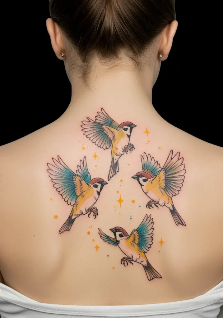 This charming back tattoo features four beautifully detailed sparrows mid-flight, surrounded by soft orange sparkles and stardust. Their wings are a dreamy gradient of teal and lavender, and each bird has its own unique posture like they re caught dancing through the air. The symmetry is spot-on, making the whole piece feel graceful and balanced across the upper back.