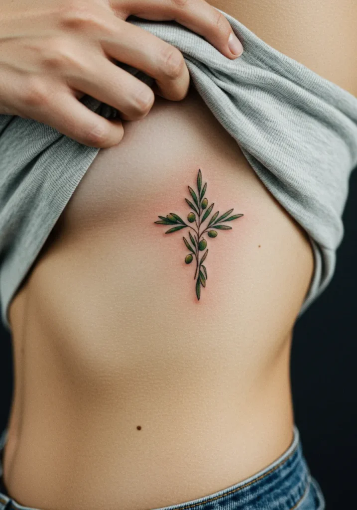 This delicate rib tattoo forms a subtle cross using soft green olive branches with tiny olives nestled between the leaves. The design is clean, dainty, and perfectly placed tucked just under the curve of the ribs. The muted greens feel earthy and calm, and the natural shape of the leaves gives it a sweet, organic flow.