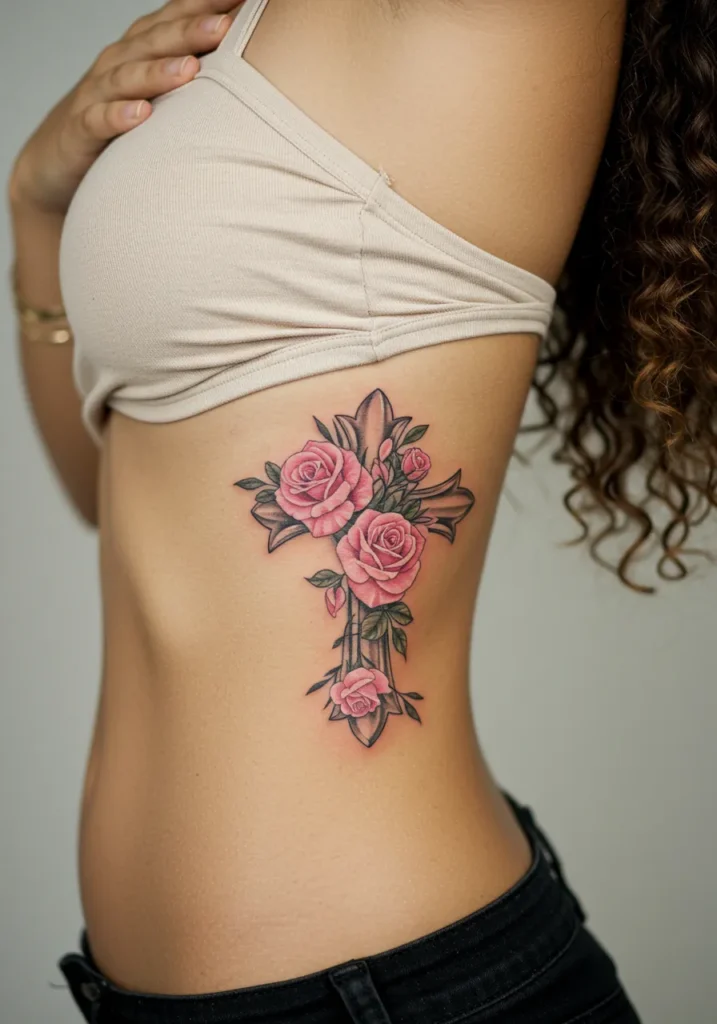 This stunning rib tattoo combines a graceful Christian cross with blooming pink roses that wrap around it like they were made to be there. The floral details are lush and feminine, with soft shading that makes each petal look almost velvety. The cross peeks through the bouquet, giving just enough structure without overpowering the delicate vibe. It s elegant, perfectly balanced, and flows beautifully with the curve of the body.