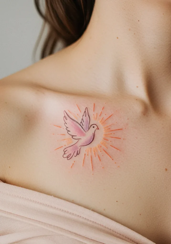 This delicate shoulder tattoo features a graceful dove mid-flight, glowing with soft pink and lilac tones. Surrounding it is a burst of warm orange rays, giving it a heavenly, sun-kissed aura. The fine lines and subtle shading make the design feel almost weightless, like the bird might lift off at any second. It sits perfectly on the upper chest area, highlighting the collarbone in such a flattering way.