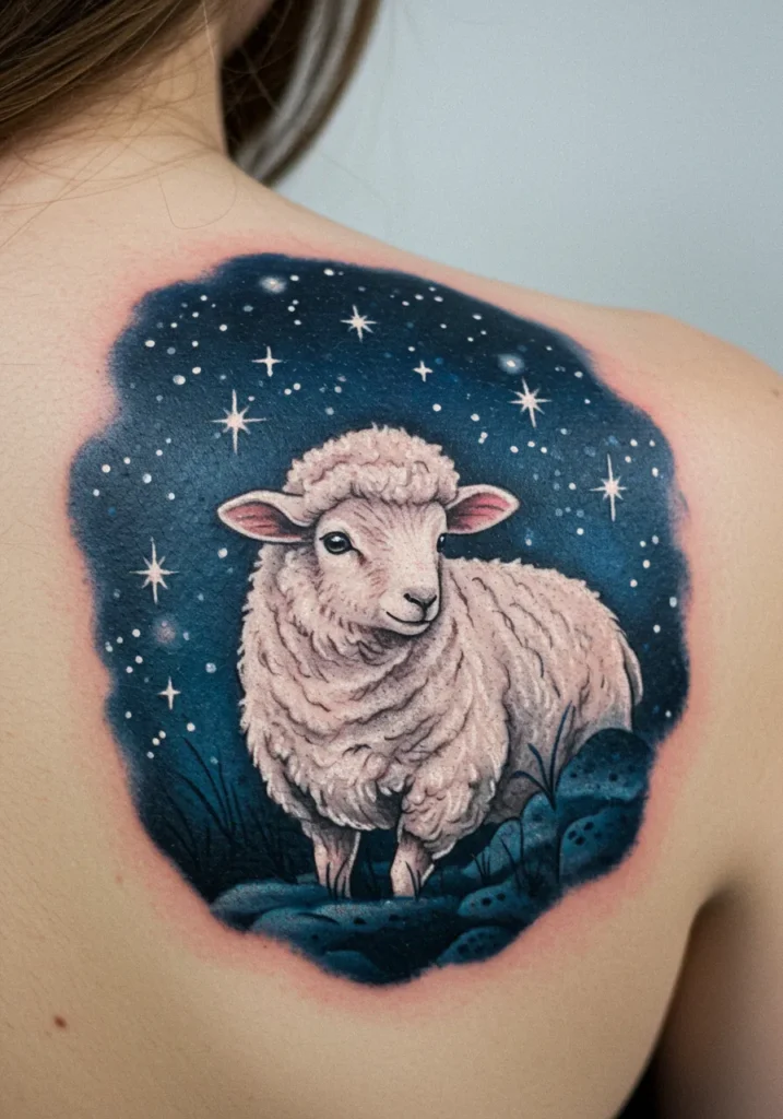 This incredibly artistic tattoo, placed on the shoulder blade, features a fluffy, sweet-faced lamb. The level of detail is amazing, with soft whites and subtle pinks creating a realistic, textured wool coat. This gentle creature is set against a rich, deep blue night sky sprinkled with bright, shining stars. The color saturation is fantastic, making the entire piece look like a beautiful painting.