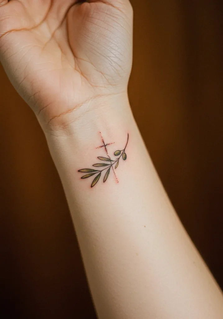 This is the perfect example of a dainty and meaningful tattoo. Placed on the delicate inner wrist, it features a small, elegant olive branch with soft green leaves and a couple of tiny olives. Intertwined with the branch is a tiny cross, cleverly created with fine dotwork in subtle black and red ink. The overall design is minimalist, clean, and incredibly chic.