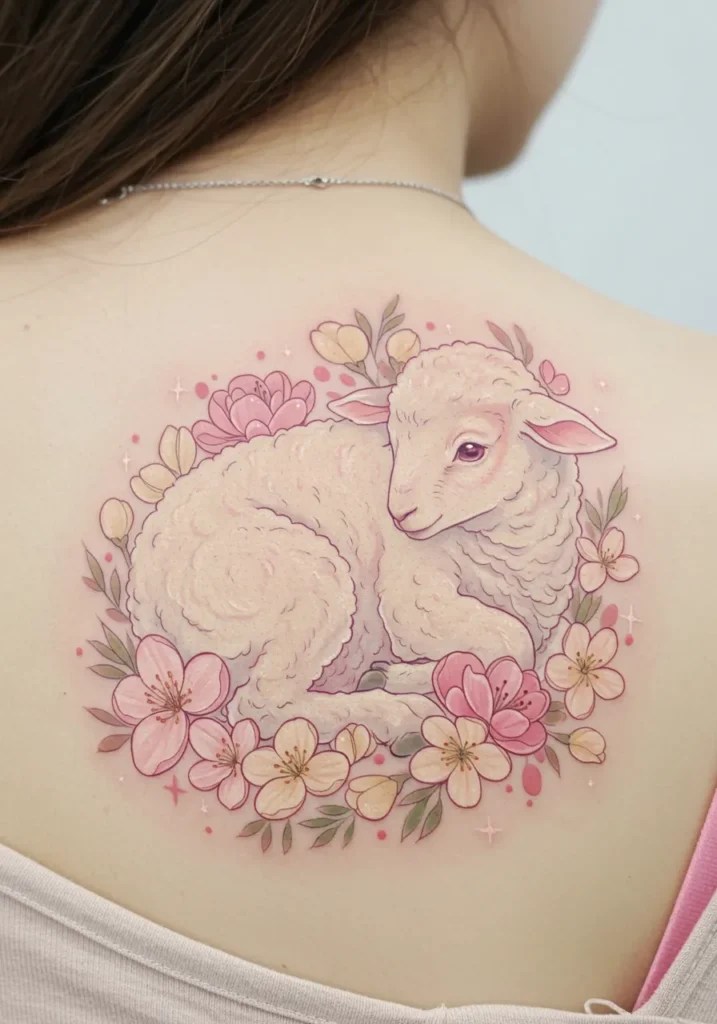 This dreamy upper back tattoo features a soft, fluffy lamb nestled in a wreath of pastel pink and yellow blossoms. The linework is delicate, and the lamb s gentle eyes make it look like it s straight out of a storybook. The soft shading, little sparkles, and cozy floral arrangement make everything feel calm, sweet, and almost magical.