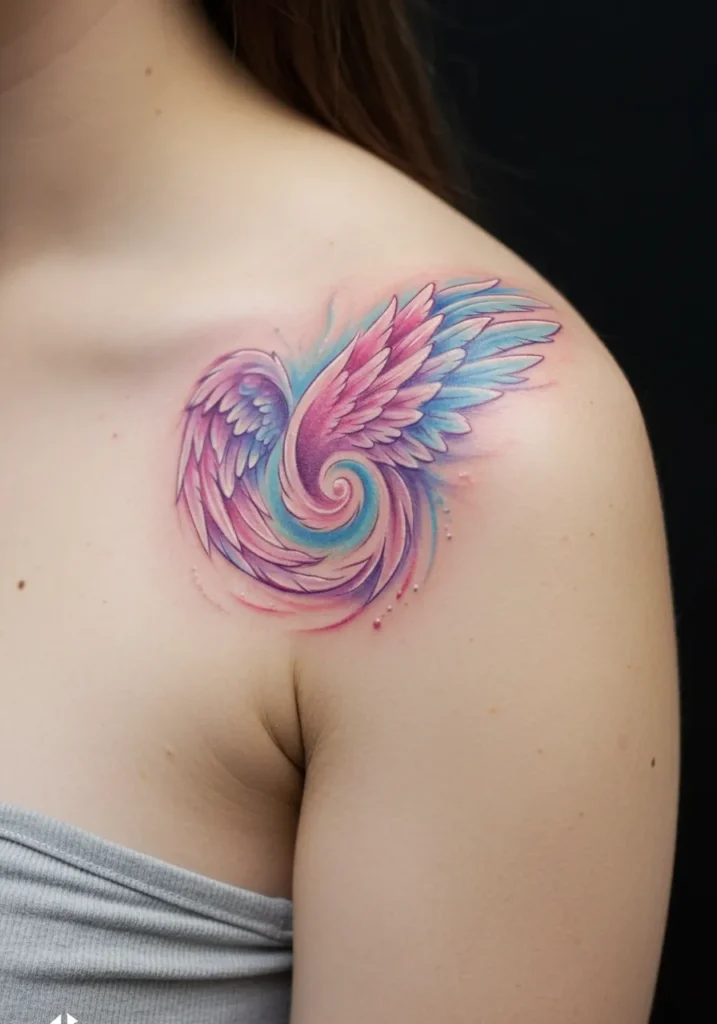 This vibrant shoulder tattoo features a mesmerizing swirl of angel wings, blending shades of pink, lavender, and sky blue into a soft, dreamy spiral. The wings curve in toward each other like a cosmic hug, with feathered edges that feel both fierce and graceful. There s a subtle glow effect around the outside that makes the whole piece look like it s in motion.