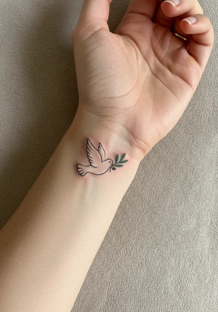 This sweet little wrist tattoo features a minimalist white dove holding a green olive branch, done in clean, fine lines with just a hint of soft color. It s tiny but powerful, perfectly placed on the inner wrist where it s both discreet and meaningful. The simple design keeps things elegant while still packing a spiritual punch.