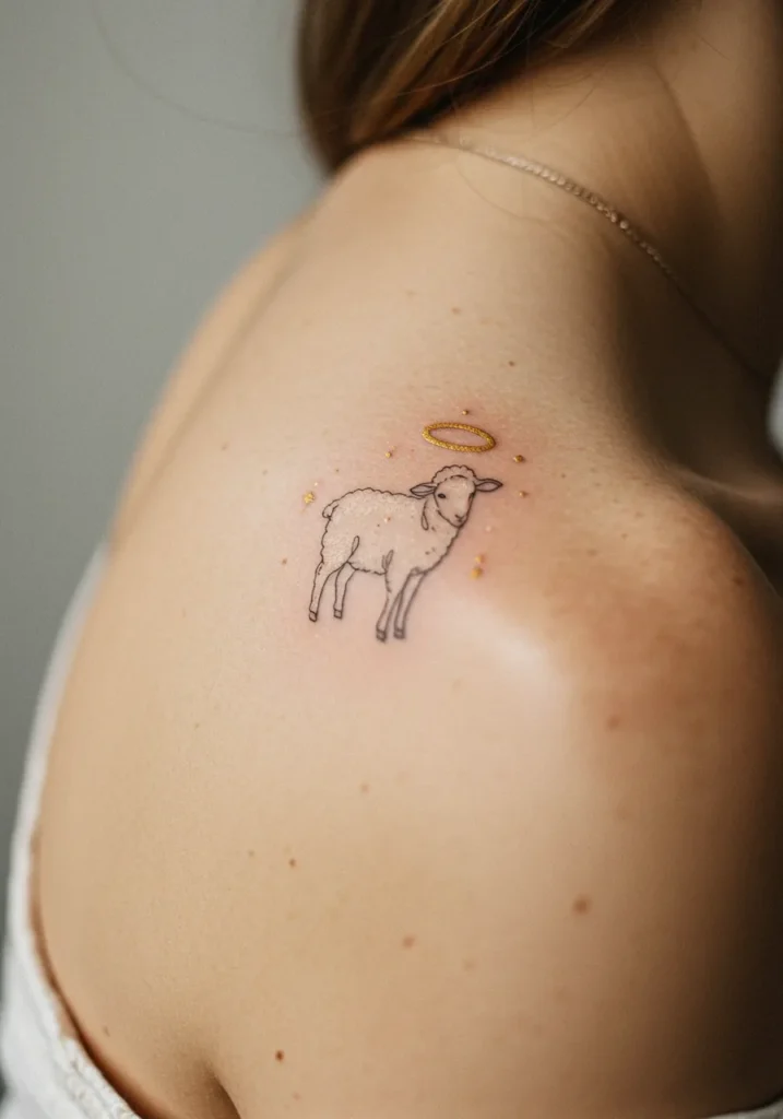 This darling little shoulder tattoo shows a sweet lamb drawn in fine black lines with the softest expression. Right above its head floats a golden halo, surrounded by tiny gold sparkles that add just the right touch of magic. The placement on the back of the shoulder feels so gentle and elegant, like a quiet nod to something deeply meaningful.