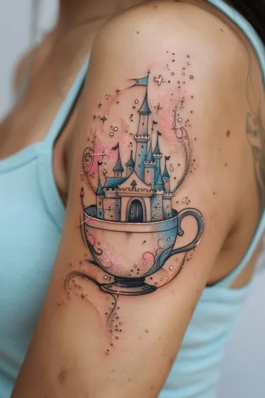 This adorable upper arm tattoo features a magical castle rising from inside a delicate teacup, surrounded by soft pink sparkles, swirling stardust, and the tiniest twinkling stars. The castle s blue rooftops and whimsical flags give it a charming storybook look, while the soft blush background adds a dreamy, fairylike glow. The entire design feels like it belongs in a pastel fantasy, and the curved lines give it a floating, light-as-air vibe that fits the arm placement beautifully.