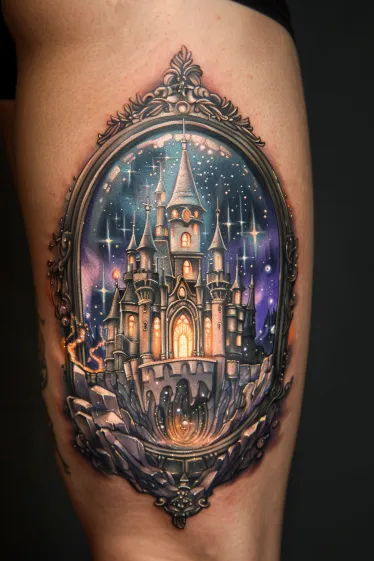 This thigh tattoo looks like it was plucked straight out of a magical storybook and sealed in an antique frame. A glowing fairytale castle rises from rocky cliffs, wrapped inside an intricately designed oval border that gives the entire piece the feel of a vintage portrait or enchanted mirror. The night sky swirls with stars and cosmic purples while warm golden light spills out of the castle windows, creating this dreamy contrast that feels both regal and whimsical.