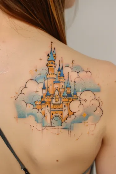 This dreamy back tattoo features a golden peach-colored fairytale castle floating among soft, fluffy clouds with hints of blue and magical sparkles scattered all around. The design is clean and vibrant, with delicate linework outlining the clouds and shimmering accents adding that extra twinkle of enchantment. The castle itself is detailed with royal blue rooftops and elegant towers that point toward the sky, creating the perfect centerpiece for a whimsical design. The placement right on the upper back lets the entire scene breathe and glow.