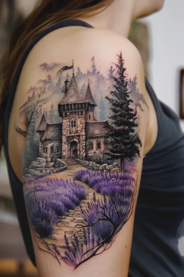 This charming upper arm tattoo features a cozy castle tucked into the forest, complete with warm stone walls, pointed rooftops, and a flag flying proudly at the top. A winding cobblestone path leads right through a blooming lavender field, adding a dreamy splash of purple that draws your eyes all the way up to the castle doors. Behind it all, soft trees and misty mountains create a peaceful backdrop that feels both enchanted and grounded in nature. The whole piece is detailed, earthy, and beautifully balanced.