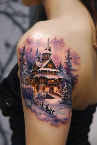This charming shoulder tattoo captures the coziest winter fairytale imaginable. A castle-like wooden manor glows from within, nestled in a quiet snowy forest under a sky dusted with soft pink clouds and falling snowflakes. Pine trees sparkle with frost while a snow-covered path leads to the warmly lit front door, welcoming you into the scene. The purples, creams, and warm golden tones melt together perfectly, creating the ultimate frozen fantasy moment without ever feeling cold or distant.