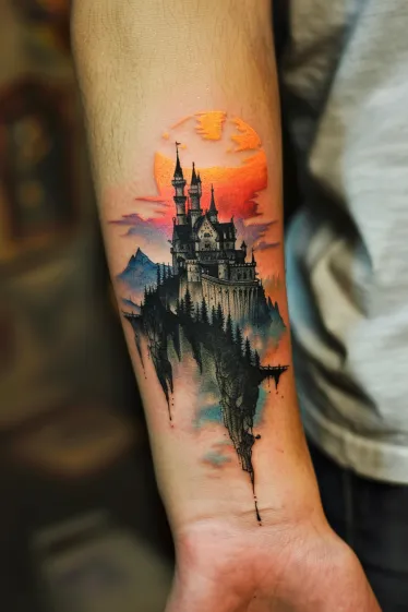 This gorgeous forearm tattoo features a dramatic fairytale castle perched high on a jagged cliff, with dark evergreen trees spilling down into the mist below. In the background, a glowing orange sun sets behind the castle, casting warm light across the clouds and turrets. The blending of moody shadows with the vibrant sunset makes the entire piece feel like a scene frozen in a magical moment. It s beautifully framed and perfectly shaped to flow along the arm, almost like it s meant to be worn like armor.