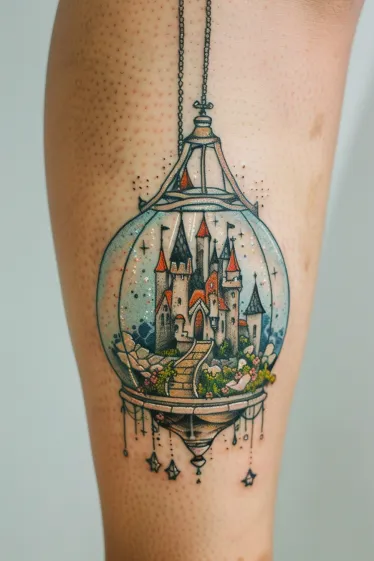 This adorable calf tattoo features a miniature fairytale castle perfectly tucked inside a glass ornament. The castle has red-orange rooftops, dainty towers, and a little cobblestone path leading through a magical garden full of flowers and stars. The glass bauble hangs from an ornate string, complete with tiny dangling charms that sparkle with fantasy energy. The details are delicate, the colors are soft yet rich, and the whole piece looks like a snow globe that belongs in a princess s jewelry box.