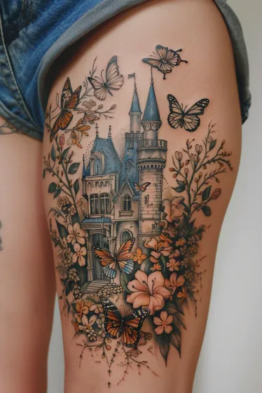 This enchanting thigh tattoo brings full-on storybook energy. It features a tall, elegant castle with soft blue rooftops nestled in a garden blooming with warm-toned flowers. Surrounding the castle are fluttering butterflies in golden orange and soft cream shades, scattered all the way up the thigh. The florals frame the entire piece perfectly, adding balance and movement. The detail is so crisp you can practically feel the breeze moving the wings and petals. It s large enough to make a big statement, but still keeps a soft and romantic vibe throughout.