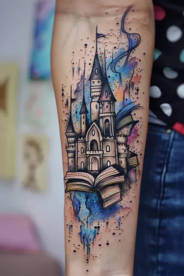 This magical forearm tattoo brings fantasy to life with a castle literally rising from the pages of an open book. The design has a dreamy watercolor vibe, with splashes of cosmic blues, purples, and hints of pink surrounding the castle like enchanted mist. Stacked books float around the base, adding that perfect nod to lovers of stories and imagination. The black outlines of the castle are strong and storybook-like, while the soft color gradients in the background give it a whimsical, spellbinding feel.