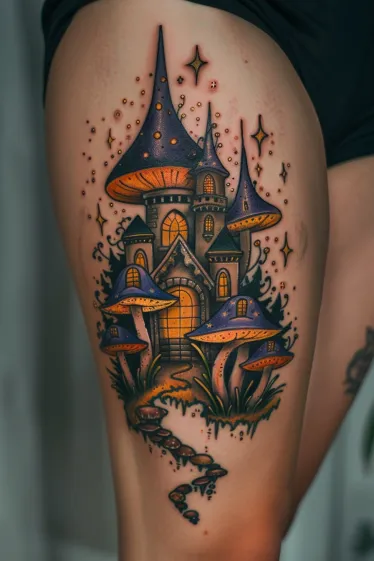 This tattoo is like a page straight out of a whimsical fairy tale. A charming castle rises up with mushroom cap rooftops, glowing warmly with amber light as if something magical is happening inside. Oversized toadstools surround the pathway, guiding your eyes right up to the arched front door. Deep purples, rich oranges, and earthy greens bring this mystical scene to life, while sparkly stars float around the castle like a dreamy spell was just cast.