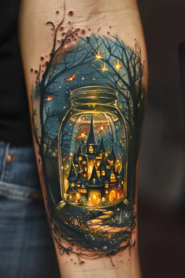 This enchanting tattoo features a cozy little castle nestled inside a glowing mason jar, set in the middle of a whimsical nighttime forest. Golden lights twinkle inside the jar, making the castle feel warm and alive, while stars and tiny birds float gently through the dark, dreamy background. The surrounding trees frame the scene beautifully, and there s a subtle magical path leading right to the jar s base like it s inviting you in. The color work is rich and luminous, especially the contrast between the deep midnight blues and the soft glowing yellows.