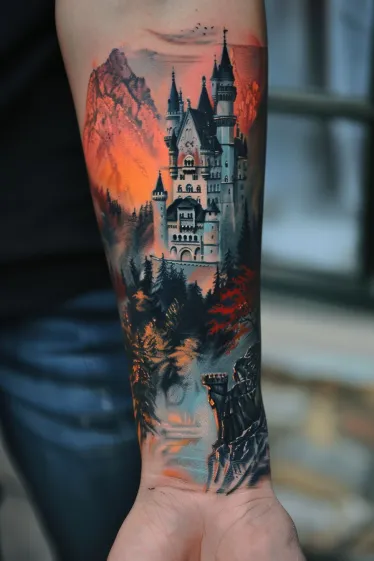 This striking forearm tattoo brings major moody fairytale energy. A towering castle rises dramatically above a dense forest, all bathed in the fiery glow of an orange and red sky. The mountain backdrop adds even more grandeur, while deep shadows in the pine trees below create an eerie, enchanted forest vibe. And at the bottom? A mysterious cloaked figure on horseback approaches the castle gate, adding a sense of story and movement that makes this tattoo feel like a scene pulled straight from a fantasy epic.