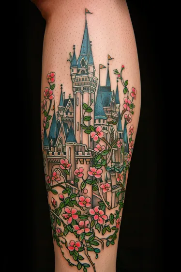 I seriously can t get over how magical this piece looks. It feels like something straight out of a storybook, but right there on skin. The blue tones of the castle against the warm pinks of the flowers? Total color goals. And the way the floral vines wrap so naturally around the castle gives it a secret garden vibe I m completely obsessed with. If you re into that soft, elegant fairytale aesthetic, this is the kind of tattoo that will make your inner princess squeal.