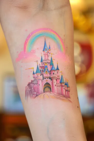 I m honestly in love with how happy this tattoo feels. It s like your childhood dream castle got its own makeover with glitter and pure serotonin. The rainbow is so soft and playful, and that pink castle? Absolute princess vibes. It gives off major joyful energy without being too loud. If you re the kind of person who loves pastels, sparkles, and all things magical, this tattoo is basically your personality in ink.