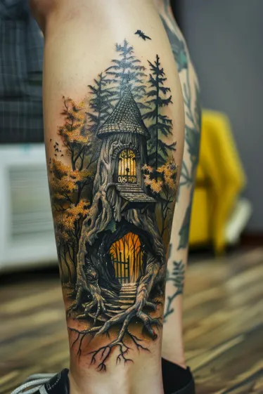 This leg tattoo looks like something pulled straight from a dark fairytale and I am obsessed. It features a tall treehouse-style castle that seems to have grown naturally out of ancient twisted roots. The structure is carved right into the tree itself, with glowing golden light pouring from the tiny windows and doorway. The castle sits beneath a canopy of tall pine trees, and there s even a little crow flying overhead for that perfect touch of forest mystery. The rich golden hues against the moody woods give it a magical glow that instantly catches the eye.