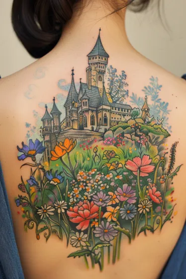 I m completely in love with how cheerful and dreamy this tattoo is. The colors are so bright and happy, and that wildflower meadow? I want to walk barefoot through it immediately. It gives me total storybook vibes with a hint of old garden fairytale magic. It s the kind of tattoo that makes you feel like the main character in your own soft fantasy world. Honestly, if you ve ever wished you could live in a castle surrounded by flowers, this tattoo brings that whole daydream to life.
