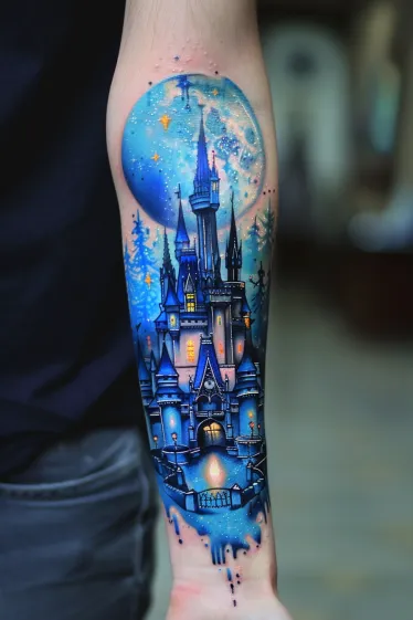 This magical forearm tattoo features a towering fairytale castle glowing under the light of a dreamy full moon. The castle is drenched in deep blues and purples, with tiny golden windows lit up like someone s home inside. Surrounding it are subtle pine trees, twinkling stars, and a dreamy watercolor sky that drips down toward the wrist. The entire piece is full of texture, contrast, and just enough sparkle to make it feel straight out of a midnight fairytale.