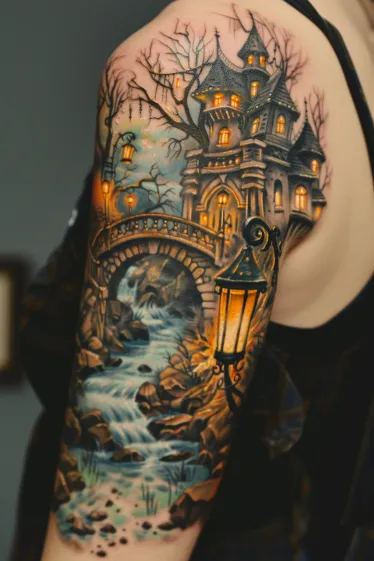 This spellbinding upper arm tattoo looks like it was ripped right from the pages of a gothic fairytale. A tall, spooky castle glows with warm golden windows, perched at the edge of a misty forest. A stone bridge stretches over a rushing stream, with detailed cobblestones and antique lanterns lighting the way. The whole piece is rich in moody color, blending deep shadows with glowing highlights that make everything shimmer like candlelight. Twisted trees and softly glowing lamps give the scene just the right mix of mystery and charm.