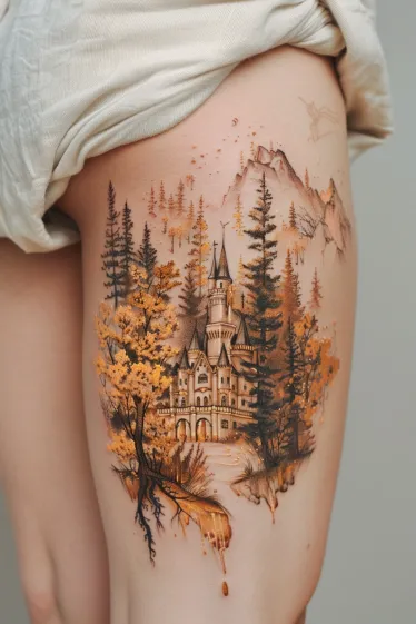 This beautiful thigh tattoo captures the perfect fairytale moment tucked inside a golden autumn forest. The castle stands tall and grand in the middle of the scene, surrounded by vibrant fall foliage in rich oranges and soft browns. Tall pine trees frame the castle like guardians, and there s a charming little path leading toward the arched gates. In the background, misty mountains rise up into the sky, giving it a layered, dreamy atmosphere. It s all done in warm, earthy tones that feel cozy and magical at the same time.