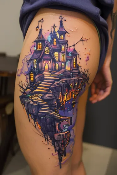 This bold and enchanting thigh tattoo features a gothic-style castle perched dramatically at the edge of a rocky cliff, with glowing lanterns and swirling purple smoke adding a mysterious flair. The staircase leading up to the castle twists through jagged rocks, while molten orange light glows beneath the stone, giving it an almost magical volcano vibe. Each window of the castle is lit with a warm yellow hue that contrasts beautifully with the cooler purples and blues in the shadows.