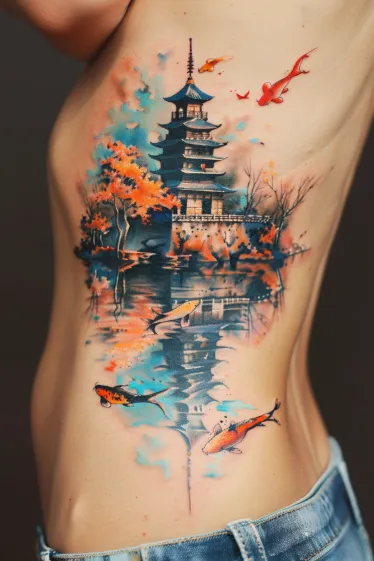 This stunning rib tattoo features a traditional Japanese castle reflected perfectly in calm water, with bright orange koi fish swimming just beneath the surface. Autumn trees glow in fiery shades of red and orange, giving the whole piece that peaceful golden-hour warmth. The watercolor effect around the scene creates this gorgeous soft blend of blues and peach tones, which makes the castle and koi stand out even more. The entire composition flows beautifully with the curves of the body, making it feel natural and elegant at the same time.