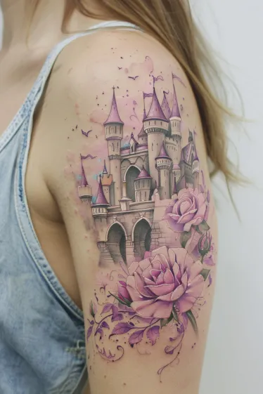 This dreamy shoulder tattoo features a grand fairytale castle with soft lavender rooftops, set against a backdrop of fluttering birds and watercolor clouds. The castle sits above two large blooming pink roses, their petals delicate and swirling with tiny flourishes and sparkles that tie the whole piece together. Everything is shaded in romantic purples and blush tones, creating a soft, elegant vibe that still manages to feel bold and detailed. The flow of the design works beautifully with the curve of the arm, like the castle is rising straight out of a garden spell.